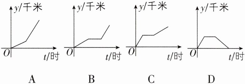 2 李叔叔开车上班,最初以某一速度匀速行驶,中途停车加油耽误了几分,为了按时到单位,李叔叔在不违反交通规则的前提下加快了速度,仍保持匀速行驶,则汽车行驶的路程$y$(千米)与行驶的时间$t$(时)的函数关系的大致图象是 ( )