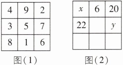 (2)中左下角的数为6+20-22=4,则最中间的数为x+6-4=x+2或x+6+20-22-y=x-y+4,右下角的数为6+20-(x+2)=24-x或x+6-y,所以{x+2=x-y+4,24-x=x-y+6,解得{x=10,y=2,所以x与y的积为10×2=20.故答案为20.