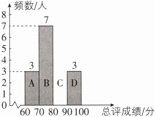 (3)如图是这19名学生总评成绩的频数直方图(不完整),学校决定根据总评成绩x择优选拔9名广播员.(A:$60\leqslant x<70$;B:$70\leqslant x<80$;C:$80\leqslant x<90$;D:$90\leqslant x\leqslant 100$)