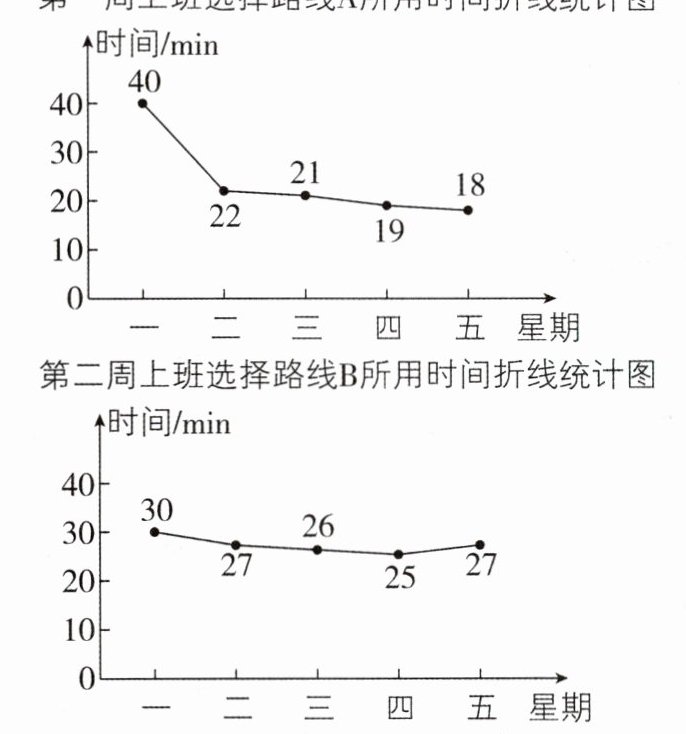 (3)对比这两周的折线统计图,建议周老师星期一上班选择路线B,星期二到星期五上班选择路线A.(建议合理即可)