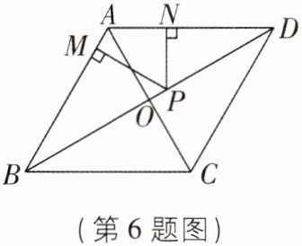 6 [2024 辽宁锦州期中]如图,在菱形$ABCD$中,$∠ABC = 60^{\circ}$,对角线$AC$,$BD相交于点O$,$P是对角线BD$上的一动点,且$PM⊥AB于点M$,$PN⊥AD于点N$。有以下结论:①$\triangle ABC$为等边三角形;②$OB = \sqrt{3}OA$;③$∠MPN = 60^{\circ}$;④$PM + PN = \frac{1}{2}BD$。其中正确的有( )