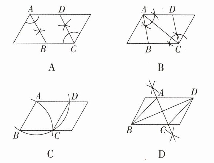 A 【解析】A 由作法得 $\angle DAB=\angle BCD$. 因为 $AD// BC$,所以 $\angle DAB+\angle ABC=180^\circ$,所以 $\angle BCD+\angle ABC=180^\circ$,所以 $AB// CD$,则四边形 ABCD 为平行四边形 符合题意 B 由作法得 $\angle BAC=\angle DAC$, $\angle DCA=\angle BCA$,则 $\triangle ADC\cong \triangle ABC$,所以 $AB=AD$, $BC=CD$. 因为 $AD// BC$,所以 $\angle DAC=\angle BCA$,所以 $\angle BAC=\angle BCA$,所以 $AB=BC$,所以 $AB=BC=AD=CD$,则四边形 ABCD 为菱形 不符合题意 C 连接 AC,由作法得 $BA=BC$, $AD=AB=AC$,则 $\triangle ABC$ 为等边三角形,所以易知 $\triangle ACD$ 为等边三角形,所以 $AB=BC=CD=AD$,则四边形 ABCD 为菱形 不符合题意 D 由作法得 AC 垂直平分 BD,所以 $AB=AD$, $CB=CD$,则易得 $\triangle ABD\cong \triangle CBD$,所以 $BA=BC=CD=AD$,则四边形 ABCD 为菱形 不符合题意