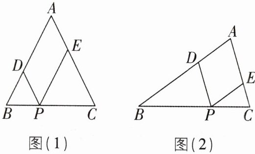 5 核心素养推理能力[2024 河南郑州调研,中]如图(1),△ABC 为等腰三角形,AB= AC= 6,P 点是底边 BC 上的一个动点,PD//AC,PE//AB,D,E 分别在 AB,AC 上.