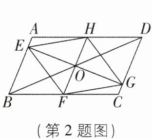 2 [2025 湖北恩施州期末,中]如图,过□ABCD 的对角线 BD 的中点 O 作两条互相垂直的直线,分别交 AB,BC,CD,DA 于 E,F,G,H 四点,连接 EF,FG,GH,HE,下列结论正确的是$ ( )A. FH= AB B. S_{四边形EFGH}= \frac{1}{2}S_{四边形ABCD}C. FG= \frac{1}{2}BD D. $四边形 EFGH 是菱形