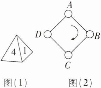 6核心素养数据观念[较难]如图(1),一枚质地均匀的正四面体骰子,它有四个面并分别标有数字1,2,3,4.如图(2),正方形ABCD顶点处各有一个圈.跳圈游戏的规则为游戏者每掷一次骰子,骰子着地一面上的数字是几,就沿正方形的边按顺时针方向连续跳几个边长.