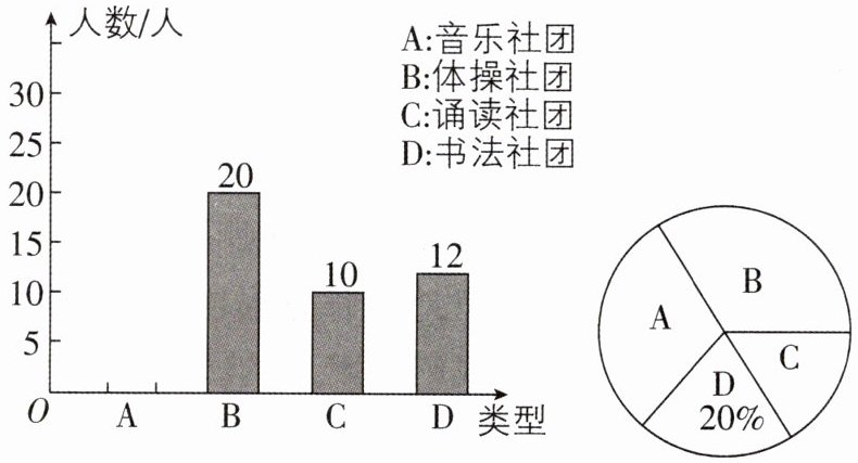 5[2024黑龙江绥化中考]为了落实国家“双减”政策,某中学在课后服务时间里,开展了音乐、体操、诵读、书法四项社团活动.为了了解七年级学生对社团活动的喜爱情况,该校从七年级全体学生中随机抽取了部分学生进行“你最喜欢哪一项社团活动”的问卷调查,每人必须选择一项社团活动(且只能选择一项).根据调查结果,绘制成如下两幅统计图.请根据统计图中的信息,解答下列问题: