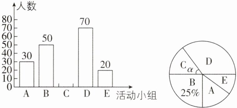 6某校为落实“双减”工作,增强课后服务的吸引力,充分用好课后服务时间,为学有余力的学生拓展学习空间,成立了5个活动小组(每位学生只能参加一个活动小组):A.音乐;B.体育;C.美术;D.阅读;E.人工智能.为了解学生对以上活动的参与情况,随机抽取部分学生进行了调查统计,并根据统计结果,绘制了如图所示的两幅不完整的统计图.