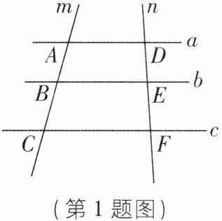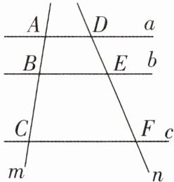 3 如图,直线 $ a // b // c $,直线 $ m $,$ n $ 与 $ a $,$ b $,$ c $ 分别相交于点 $ A $,$ B $,$ C $ 和点 $ D $,$ E $,$ F $。