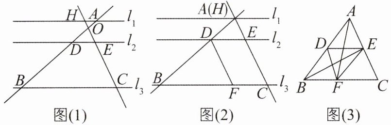 6 核心素养 推理能力 [难]如图(1),$ l _ { 1 } // l _ { 2 } // l _ { 3 } $,直线 $ A B $,$ C H $ 与 $ l _ { 1 } $,$ l _ { 2 } $,$ l _ { 3 } $ 分别相交于点 $ A $,$ D $,$ B $ 和点 $ H $,$ E $,$ C $,$ A B $ 与 $ C H $ 交于点 $ O $,已知 $ C E = 6 $,$ H E = 3 $,$ A B = 12 $。