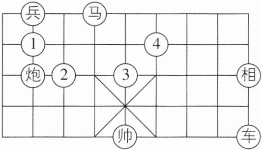 ② 【解析】设棋盘中各个小正方形的边长均为1.由题图可知,“帅”“车”“相”所在位置的格点构成的三角形的三边长分别为4,2,$2\sqrt{5}$,“兵”“炮”所在位置的格点之间的距离为2,“炮”与②所在位置的格点之间的距离为1,“兵”与②所在位置的格点之间的距离为$\sqrt{5}$.