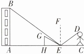 4 [中]小丽和小明想测量河对岸一建筑物的高度 AB.如图,他们先在地面上放一面平面镜 E,小丽在射线 AE 上调整自己与镜子的距离,直到刚好能从镜子中看到建筑物的顶端 B,此时她与镜子的距离 CE = 2 米,然后小明在距离建筑物 6 米处安装了一个测倾器 GH,测得∠HGE = 60°,若小丽的眼睛距离地面的高度 CD = 1.6 米,GH = 1 米,AB ⊥ AC,GH ⊥ AC,DC ⊥ AC,点 A,H,E,C 在同一条直线上.请你利用这些数据,求建筑物的高度 AB.(结果精确到 0.1 米,参考数据:$ \sqrt{2} \approx 1.414,\sqrt{3} \approx 1.732 $)