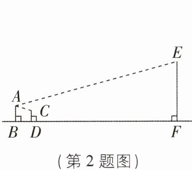 2 [2025 天津河西区质检,中]如图,小明在墙上挂了一面镜子 AB,调整好标杆 CD 的位置后,正好可以顺着标杆顶部在镜子上边缘 A 处看到旗杆的顶端 E,已知 AB = 2 m,CD = 1.5 m,BD = 2 m,BF = 20 m,则旗杆 EF 的高度为______m.