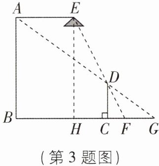 3 [2024 陕西宝鸡陈仓区期末,中]如图,AB 为路灯主杆,AE 为路灯的悬臂,CD 是长为 1.8 米的标杆.已知路灯悬臂 AE 与地面 BG 平行,当标杆竖立于地面时,主杆顶端 A、标杆顶端 D 和地面上一点 G 在同一直线上,此时小明发现路灯 E、标杆顶端 D 和地面上另一点 F 也在同一条直线上(路灯主杆底端 B、标杆底端 C 和地面上点 F、点 G 在同一水平线上).这时小明测得 FG 长 1.5 米,路灯的正下方 H 距离路灯主杆底端 B 的距离为 3 米,则路灯主杆 AB 的高度为______米.