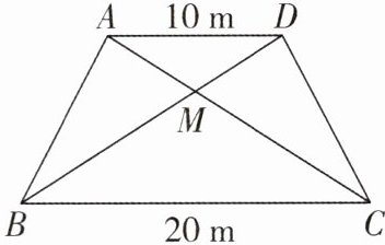 6 [2024 湖北鄂州质检]如图,某社区拟筹资金 2000 元,计划在一块上底、下底分别为 10 m,20 m 的梯形空地 ABCD 上种植花木,AC,BD 交于点 M。计划在 $\triangle AMD$ 和 $\triangle BMC$ 区域种植单价为 10 元/$m^2$ 的太阳花。