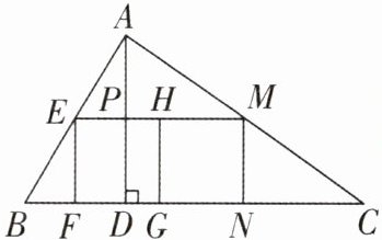 2 任意三角形内接四边形 [2025 山东菏泽质检,中]如图,在 $\triangle ABC$ 中,$AD \perp BC$,垂足为 D,$AD = 5$,$BC = 10$,四边形 EFGH 和四边形 HGNM 均为正方形,且点 E,F,G,N,M 都在 $\triangle ABC$ 的边上,EH 与 AD 交于点 P,那么 $\triangle AEM$ 与四边形 BCME 的面积比为 ____。