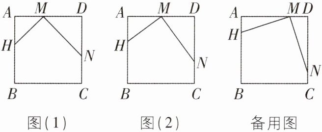 8 新考法 [2025 广西玉林期末,中]如图(1),在边长为 4 的正方形 ABCD 中,点 H 为 AB 上一动点,且 $2 \leq BH < 4$,截取 $HM = HB$,且 HM 交线段 AD 于 M,过 M 作 HM 的垂线 MN 交 DC 于 N。