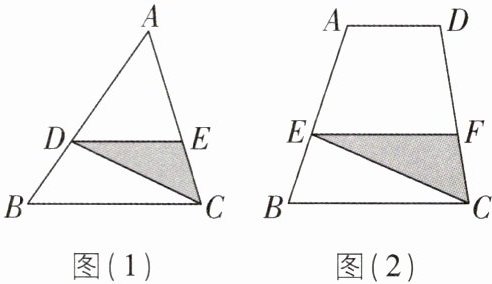 (3)如图(2)所示,在四边形 ABCD 中,$AB = 4$,$AD // BC$,$AD = \frac{1}{2}BC$,E 是 AB 上一点(不与 A,B 重合),EF // BC 交 CD 于点 F,连接 CE。设 $AE = n$,四边形 ABCD 的面积为 S,$\triangle CEF$ 的面积为 $S'$,请你利用前面问题的解法或结论,用含字母 n 的代数式表示 $\frac{S'}{S}$。
