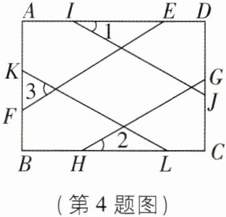4[2025山西晋中质检,中]翻花绳是中国民间流传的儿童游戏,在中国不同的地域,有不同的称法,如线翻花、翻花鼓、挑绷绷、解股等等.翻花绳的一种图案可以抽象成如图所示的图形,在矩形ABCD中,IJ//KL,EF//GH,∠1= ∠2= 30°,∠3的度数为 ( )