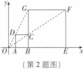 2 如图,在平面直角坐标系中,正方形 $ ABCD $ 与正方形 $ BEFG $ 是以原点 $ O $ 为位似中心的位似图形,且相似比为 $ \frac{1}{3} $,点 $ A,B,E $ 在 $ x $ 轴上,若正方形 $ BEFG $ 的边长为 6,则 $ D $ 点坐标为( )