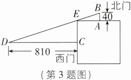 3 如图,一座正方形城池北边、西边正中A,C处各开一道门,从点A往正北方向走40步刚好有一棵树位于点B处,从点C往正西方向走810步到达点D处时正好看到此树,则正方形城池的边长为( )