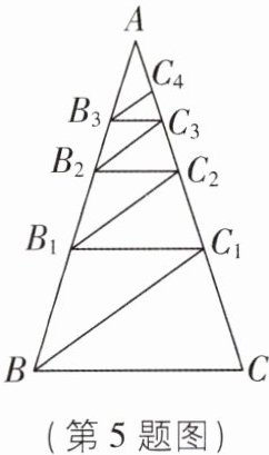 5 [2025湖北武汉调研]顶角为36°的等腰三角形称为黄金三角形,如图所示,△ABC中,AB= AC,∠A= 36°,其中BC/AC= (√5 - 1)/2≈0.618.作∠ABC的平分线$BC_1,$交AC于$C_1,$得到黄金三角形$BCC_1;$作$C_1B_1//BC$交AB于$B_1,B_1C_2//BC_1$交AC于$C_2,$得到黄金三角形$B_1C_1C_2;$作$C_2B_2//BC$交AB于$B_2,B_2C_3//BC_1$交AC于$C_3,$得到黄金三角形$B_2C_2C_3;$…,依次类推,我们可以得到无数个黄金三角形.若BC的长为1,那么$C_5C_6$的长为( )