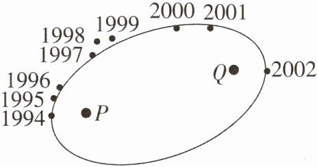5[2024甘肃兰州中考,中]科学家对银河系中心附近的恒星S2进行了多年的持续观测,给出了从1994年到2002年间恒星S2的位置如图所示,科学家认为S2恒星的运动轨迹是一个椭圆。推测银河系中心可能存在着超大质量的黑洞。忽略S2恒星质量的变化,根据图片信息,下列说法中正确的是(