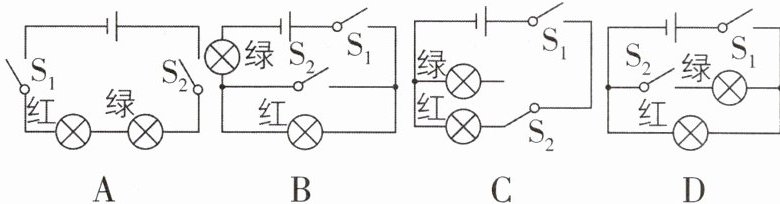 3 [2023江苏宿迁中考,中]下列电路中,符合直行方向交通信号灯(只考虑红灯和绿灯)模拟设计的是(