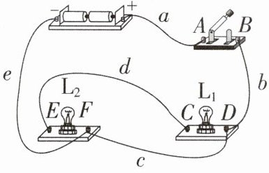 1 [2025江苏南京调研,中]如图所示为某同学连接的电路,要求仅改变一根导线使两灯并联,做法如下:①仅将导线b与D接线柱相连的一端改接至C;②仅将导线c与D接线柱相连的一端改接至C;③仅将导线e与F接线柱相连的一端改接至C;④仅将导线e与F接线柱相连的一端改接至E。其中可行的是(