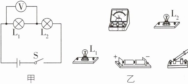 【解析】由电路图知,灯泡L₁、L₂串联,电压表并联在L₁两端,又由图乙实物图知,电源由两节干电池串联而成,电源电压约为3V,所以电压表应选择小量程,电流从电压表的正接线柱流入,负接线柱流出,实物图连接如图所示。