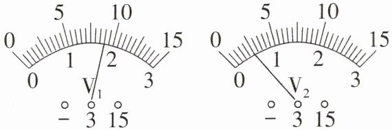 1.8 2.5 【解析】因为电压表V₁的指针比电压表V₂的指针偏转的角度大,但是电压表V₁的示数比电压表V₂的示数小一些,则两个电压表一定没有采用同一个量程,电压表V₁选择的是“0~3V”的量程,分度值为0.1V,示数为1.8V;电压表V₂选择的是“0~15V”的量程,分度值为0.5V,示数为2.5V。