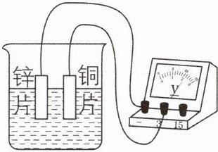 6 核心素养 科学探究 [中]在烧杯中加入盐水,将铜片和锌片放在盐水中,这就是一个盐水电池。用电压表测量这个自制电池的电压,其现象如图所示。则以下说法正确的是 (