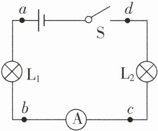 3 [中]如图所示的电路中,闭合开关 S,灯 $ L_1 $、$ L_2 $ 都不发光,电流表没有示数。为了找出其中的原因,现用电压表进行检测,结果是: $ a $、$ b $ 间的电压和 $ b $、$ c $ 间的电压都为 0 V,而 $ a $、$ d $ 间的电压和 $ c $、$ d $ 间的电压都为 3 V,则电路故障可能是 (