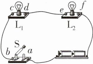 1 [2025辽宁沈阳质检,中]如图所示,闭合开关S,两灯都不亮,当用一根导线分别连接a、b接线柱,c、d接线柱时,两灯都不亮;连接e、f接线柱时,只有一个灯泡发光。则电路故障可能是(