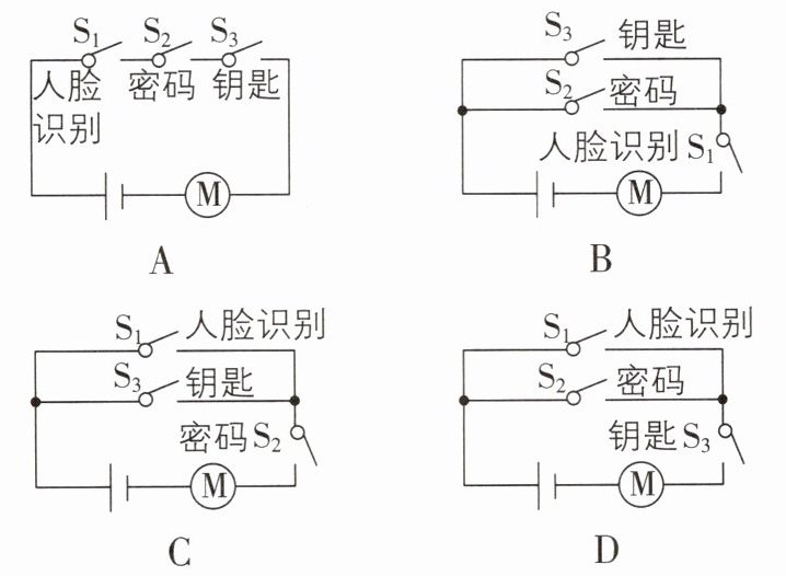 3[2024湖南中考,中]科技小组模拟“智能开锁”设计的电路图,有两种开锁方式,即“人脸识别”与输入“密码”匹配成功,或“人脸识别”与使用“钥匙”匹配成功才可开锁。现用$S_1$表示人脸识别$,S_2、$$S_3$表示密码、钥匙。匹配成功后对应开关自动闭合,电动机才工作开锁。满足上述两种方式都能开锁的电路是(