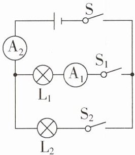 C 【解析】电路为并联电路,电流表$A_{1}$与$L_{1}$串联,测量$L_{1}$所在支路的电流,电流表$A_{2}$接在干路上,测量干路电流,并联电路干路电流等于各支路电流之和,所以电流表$A_{1}$的示数小于$A_{2}$的示数,故 A、B 错误;断开$S_{2}$,电路为$L_{1}$的简单电路,并联电路各支路互不影响,所以灯$L_{1}$所在支路通过的电流不变,灯$L_{1}$亮度不变,电流表$A_{2}$示数等于电流表$A_{1}$的示数,所以电流表$A_{2}$示数变小,故 C 正确,D 错误。故选 C。