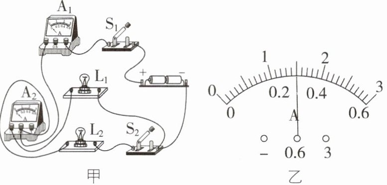 6[2025江西南昌调研,偏难]如图甲所示电路,闭合开关$S_1、$$S_2$时,灯泡$L_1$和$L_2$发光,电流表$A_1、$$A_2$的指针指在表盘同一位置,如图乙所示,下列说法中正确的是(