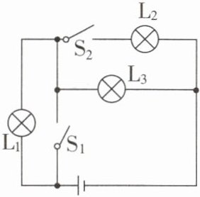 A 【解析】断开$S_{1}$和$S_{2}$,电路中电流的路径只有一条,依次经过灯泡$L_{1}$和$L_{3}$,为串联电路,故 A 正确;只闭合开关$S_{2}$,灯泡$L_{2}$和$L_{3}$并联后,再与$L_{1}$串联,为混联电路,故 B 错误;闭合开关$S_{1}$、$S_{2}$,灯泡$L_{1}$被短路,电路中电流的路径有两条,灯泡$L_{2}$和$L_{3}$组成并联电路,故 C 错误;只闭合$S_{1}$,电路为灯泡$L_{3}$的简单电路,故 D 错误。故选 A。