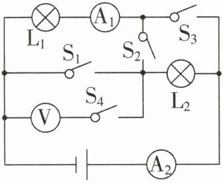 (3)若将$S_{1}$、$S_{2}$、$S_{3}$和$S_{4}$同时闭合,电源两极会被导线直接相连,造成电源短路,此时通过灯$L_{1}$的电流为0 A,电压表也被短路,示数为0 V。