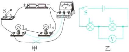 (1)从题图中可以看出,电压表并联在灯泡$L_{1}$、$L_{2}$两端,测量$L_{1}$、$L_{2}$两端的总电压,故连接错误,需将电压表并联在$L_{2}$两端。