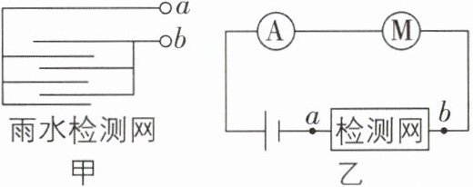 小 横截面积 【解析】由图甲可知,当检测网浸入雨水中的深度变深时,雨水接入电路中的横截面积变大,其他不变,所以 a、b 间接入电路的电阻变化是由导体横截面积的变化引起的,在其他条件不变的情况下,横截面积越大,导体电阻越小。