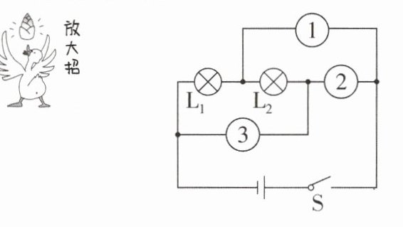 5 核心素养科学思维 [2024 福建福州期中,偏难]小明利用如图所示的电路进行实验,电源由两节新的干电池串联组成,1、2、3 是三个电表(为电压表或电流表)。闭合开关 S,灯 $ L_{1} $ 与 $ L_{2} $ 并联,电路中