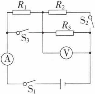(3)再闭合开关S₂、S₃,R₁被短路,R₂和R₃并联,电流表测干路的电流,电压表测电源电压由欧姆定律可知通过R₂的电流I₂ = $\frac{U}{R₂}$ = $\frac{9V}{30Ω}$ = 0.3A,通过R₃电流I₃ = $\frac{U}{R₃}$ = $\frac{9V}{40Ω}$ = 0.225A,由并联电路的电流特点可知干路的电流即电流表的示数为I' = I₂ + I₃ = 0.3A + 0.225A = 0.525A。