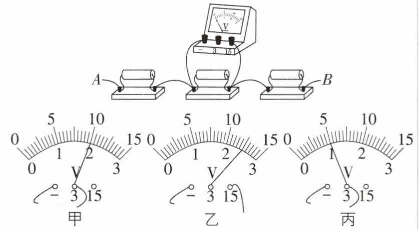 1 [2024 湖北武汉期末,中]如图所示,三个电阻串联接在电源(未画出)两端,电压表从左到右依次测出每个电阻两端的电压,测量结果分别如图甲、乙、丙所示,下列说法正确的是 (