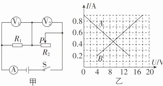 3[中](多选)如图甲所示电路,电源电压保持不变。闭合开关S,在滑动变阻器的滑片P从右端滑到左端的过程中,$R_{1}$、$R_{2}$的I-U关系图像如图乙所示。则下列判断正确的是(