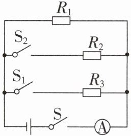 1.B [解析]当开关S闭合,$S_1$、$S_2$断开时,电路为$R_1$的简单电路,电流表测量通过$R_1$的电流;当开关S、$S_1$闭合,$S_2$断开时,$R_1$和$R_3$并联接入电路,电源电压不变,电流表测干路电流,电流表示数增加一倍,则通过$R_1$和$R_3$的电流相等,由并联电路的分流规律可知,$R_1$和$R_3$阻值相等;当开关S、$S_1$、$S_2$都闭合时,$R_1$、$R_2$和$R_3$并联接入电路,电源电压不变,电流表测干路电流,由并联电路电流规律可知通过$R_2$的电流为0.1A,由并联电路的分流规律可知,$R_1:R_2 = 1:2$,$R_1:R_3 = 1:1$,$R_2:R_3 = 2:1$,$R_1:R_2:R_3 = 1:2:1$,故ACD不符合题意,B符合题意。故选B。