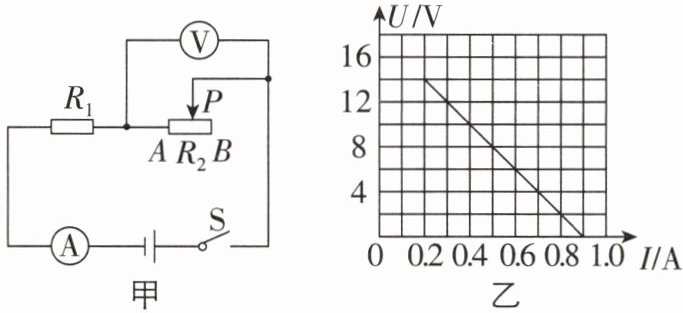 18 20 70【解析】由题图甲可知,$R_{1}$与$R_{2}$串联,电压表测$R_{2}$两端的电压,电流表测电路中的电流。当滑片位于B端时,$R_{2}$接入电路中的电阻最大,电路中的电流最小,电压表的示数最大,由题图乙可知,电压表的最大示数$U_{2}=14V$,电路中的最小电流$I_{min}=0.2A$,由$I=\frac {U}{R}$可得,滑动变阻器的最大阻值$R_{2}=\frac {U_{2}}{I_{min}}=\frac {14V}{0.2A}=70Ω$;因串联电路中总电压等于各分电压之和,所以电源电压$U = U_{1}+U_{2}=0.2A×R_{1}+14V$,当滑片位于A端时,滑动变阻器接入电路中的电阻为零,电路中的电流最大,此时电路为$ R_{1}$的简单电路,由题图乙可知,电路中的最大电流$I_{max}=0.9A$,则电源电压$U = I_{max}R_{1}=0.9A×R_{1}$,因电源电压不变,则有$0.2A×R_{1}+14V = 0.9A×R_{1}$,解得$R_{1}=20Ω$,电源电压$U = I_{max}R_{1}=0.9A×20Ω = 18V$。