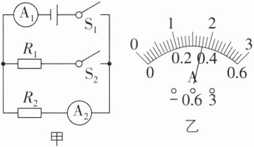5 [中]如图甲所示电路,开关$S_1、$$S_2$闭合后两电流表的指针均指在同一位置,如图乙所示,则通过$R_1$的电流为