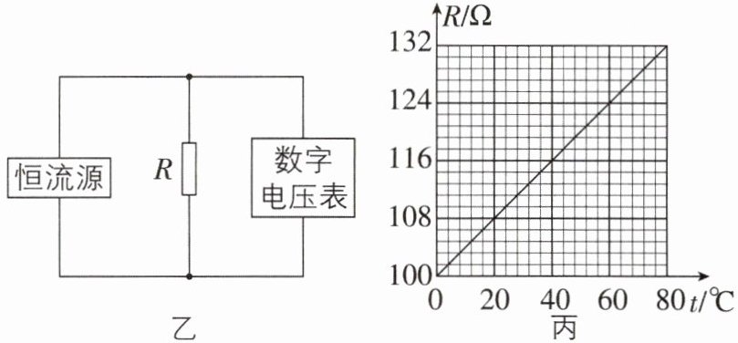 C【解析】由丙图可知,温度升高$△t = 80^{\circ }C$时,电阻变化了$△R = 132Ω - 100Ω = 32Ω,\frac {△R}{△t}=\frac {32Ω}{80^{\circ }C}=0.4Ω/^{\circ }C$,则每升高$1^{\circ }C$,R的阻值增大0.4Ω,故A错误;由丙图可知当$t = 20^{\circ }C$时,$R_{1}=108Ω$,当$t' = 30^{\circ }C$时,$R_{2}=100Ω + 30^{\circ }C×0.4Ω/^{\circ }C = 112Ω$,在乙图中,设通过R的电流恒为I,R两端的电压为$U = IR$,则当$t = 20^{\circ }C$时,$U_{1}=IR_{1}$①,当$t' = 30^{\circ }C$时,$U_{2}=IR_{2}$②,由题可知$△U = U_{2}-U_{1}=8mV$③,联立①②③式可得$U_{1}=216mV,U_{2}=224mV,I = 2mA$,故B错误,C正确;若要使该测温装置的灵敏度更高,即温度变化值相同时电压表示数变化值$△U$变大,由以上分析可知,应换一个电流值更大的恒流源,故D错误。故选C。