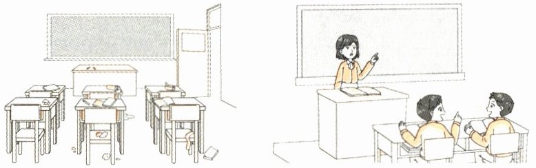 1. 仔细看图片,请针对图片中的现象提出两条班级公约,并写下来。(4分)