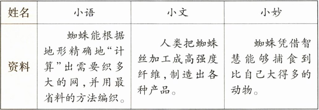 15. [新角度] 同学们要以“聪明的蜘蛛”为主题出一期班级小报。小语、小文、小妙三位同学搜集、选择的资料如表。请你根据表格及短文判断,并简要回答。(3分)